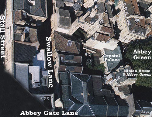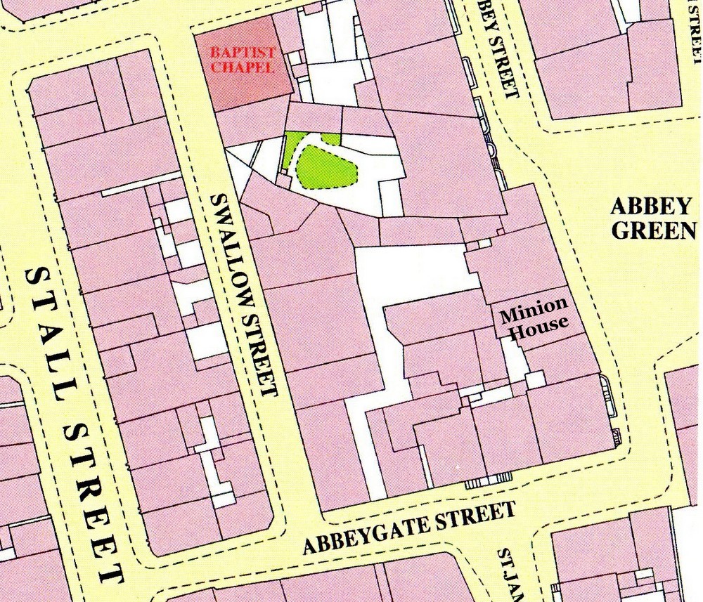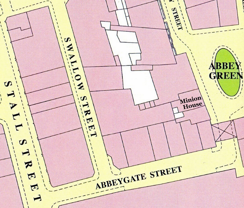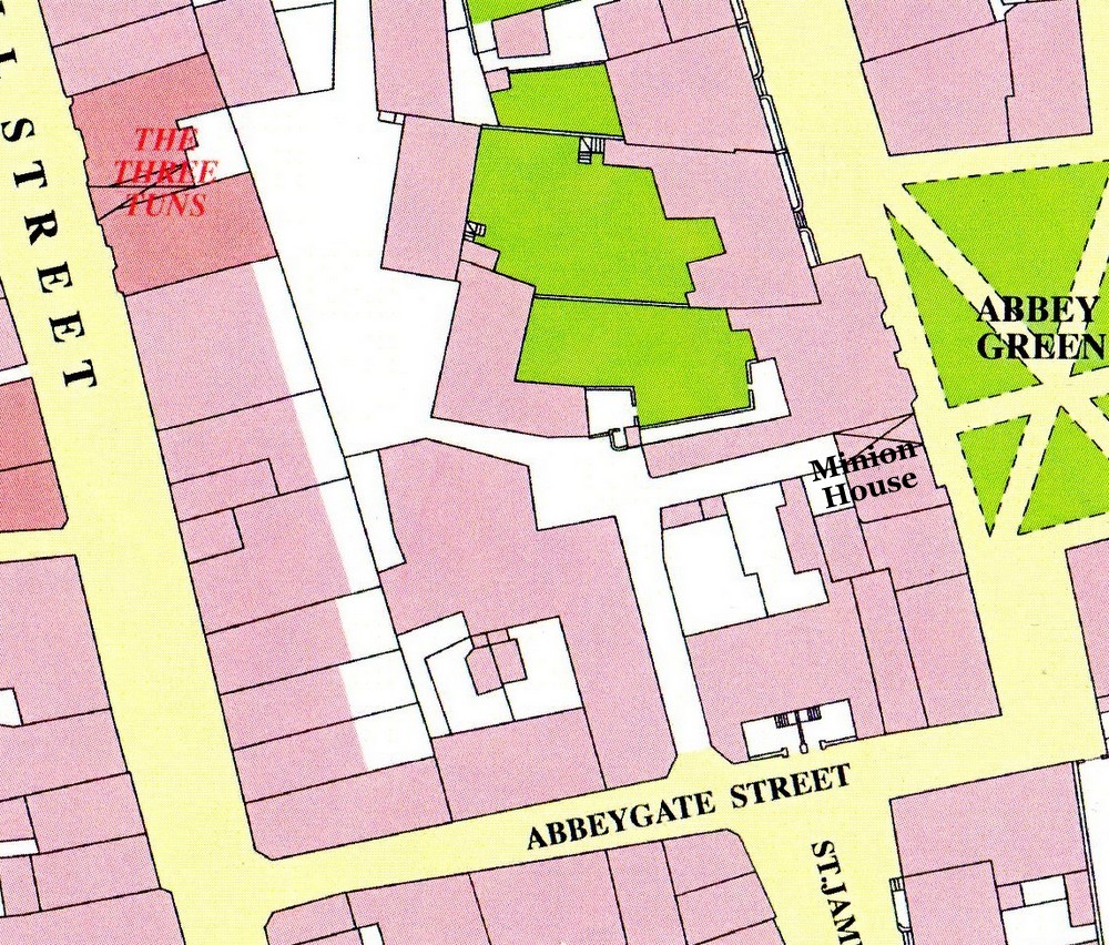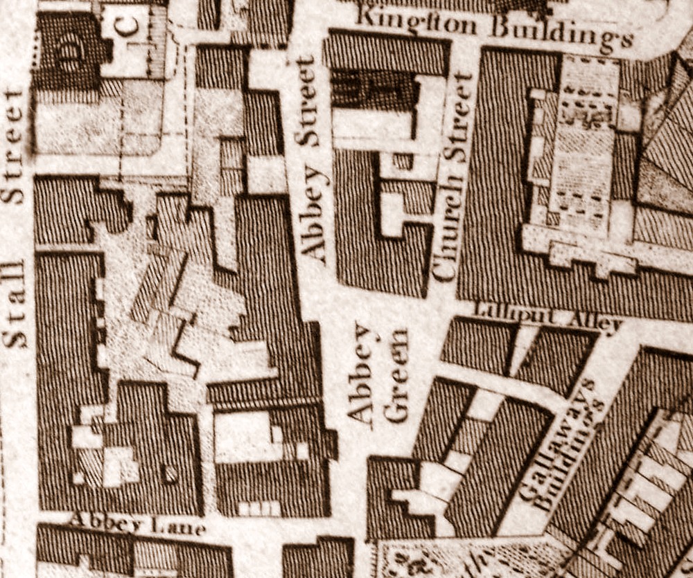 Harcourt Masters Map of Abbey Green 1795. This shows that Minion House has lost the passage way through it. It is shown passing through the neighbouring building (now the Crystal Palace). |