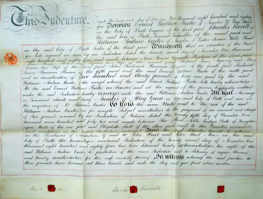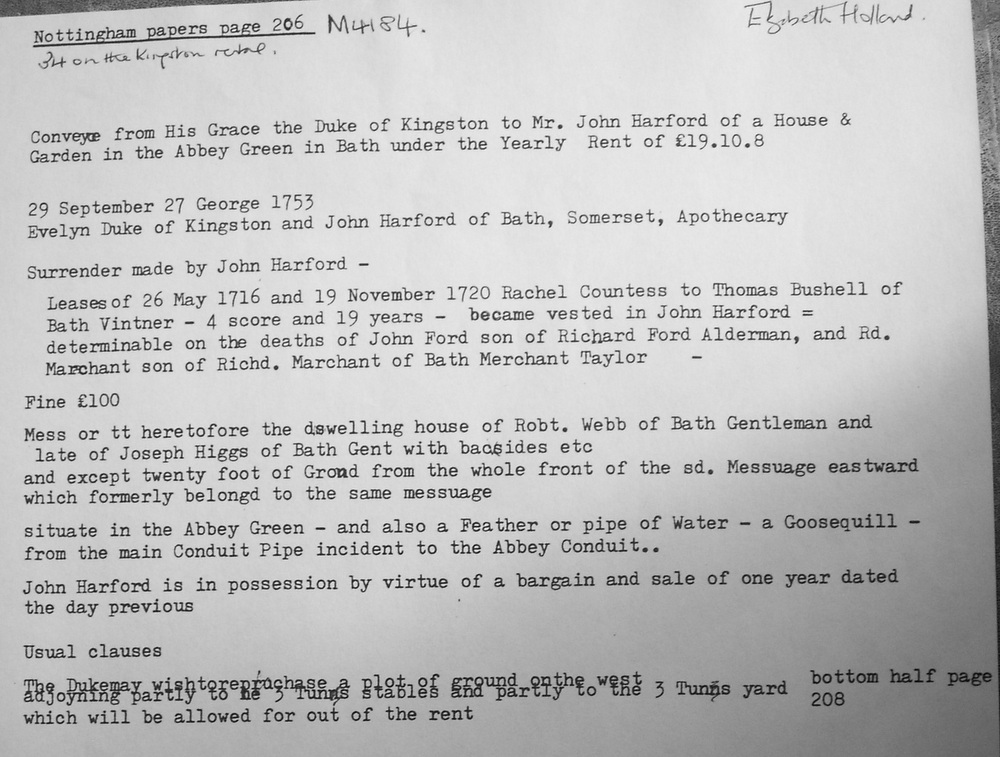 The fine Georgian building we see today replaced an earlier one whose description and history is revealed in a lease dated 1742, which can now be seen in the Manvers Collection at Nottingham University. For all the properties we now see in Abbey Green were originally owned by this family through descent from John Hall of Bradford on Avon who had purchased the estate from the Colhurst family in 1612. He was to develop it and many houses were built soon after. Some of these survive to this day in their unaltered state such as “Sally Lunns” and “2-3 Abbey Green”. No doubt one of these gabled properties originally stood on the site of Minion House. The early Lease tells us that “John Hall of Bradford on Avon in the county of Wilts, Esq. since deceased gave unto John Wiltshire of the city of Bath in the said County of Somerset, Carpenter since also deceased of the messuage or tenement here in after mentioned for the term of four score & 19 years Determinable on the several decrees of the said John Wiltshire, John Wiltshire his Son ( both since deceased ) & William Wiltshire his brother”.It shows us that a 99 year lease had been given to John Wiltshire and his descendants for a small ground rent on a plot of ground on which he would have had built a house in which he may have lived or rented out. The Wiltshire family were very wealthy and influential in the city. Again, returning to the document we learn that it had been renewed in 1684 by William Player and again in 1734. It was in this year that the Duke of Kingston, who had inherited the Estate: “made & granted by the said Duke of Kingston to John Chapman Scott & Robert Robins of the same messuage for the term of four score and 19 years to commence from and immediately after the end expiration or other sooner determined of the said term of four scare and 19 years”. It would seem John Chapman Scott had taken out a new 99-year lease on the property and was paying £5 a year ground rent to the Duke. From studying the City Records we find that he was a Cordwainer (Shoemaker) who had married Elizabeth Chapman. a Widow in 1716. They were to be blessed with a daughter, Sarah who was baptised in St. James Church in 1722. Records for Bath abbey show that John Chapman Scott was buried there in 1734. His widow, Elizabeth was to renew her lease with the Duke soon after and again the Lease informs us: This Indre made the 25th day of December 1742 Between the noble Evelyn, Duke of Kingston upon Hull of the one part & Elizabeth Scott of the Parish of Widcombe in the County of Somerset, Widow of the other part Witnesseth that for in consideration of a good and perfect surrender already had and made by the said Elizabeth Scott. If Sarah Scott, the daughter of the said Robert Chapman Scott should so long live and in consideration also of the sum of £35 of good and lawful money of Great Britain to the said Duke of Kingston”. The Lease had now been changed after she paid the Duke £35 for it to include her daughter, Sarah and continued paying him £5 a year ground rent. It also shows us that Elizabeth was then living in Widcombe, on the edge of Bath and was no doubt leasing 9 Abbey Green. When she died in 1758, she was buried with her husband in Bath Abbey. This was also to be the year in which her daughter, Sarah Scott was to marry John Brabant of Bradford on Avon, who was shown as a widower on the license for the ceremony held in St. James Church in Bath. |