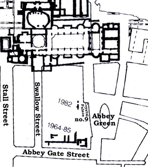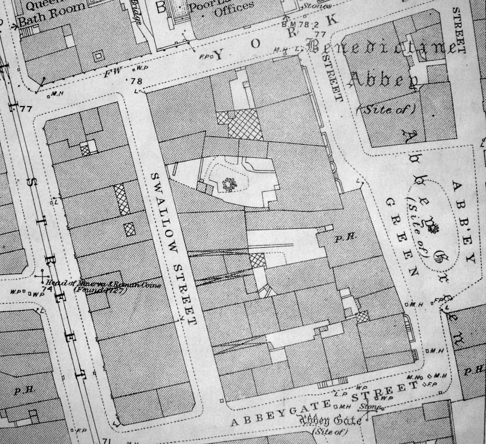 The plan above shows clearly the passage way that went to the right of the entrance to 9 Abbey Green and is now a small window. It lead originally to the rear of the Three Tuns Inn on Stall Street. The building on the right is now the Crystal Palace. |