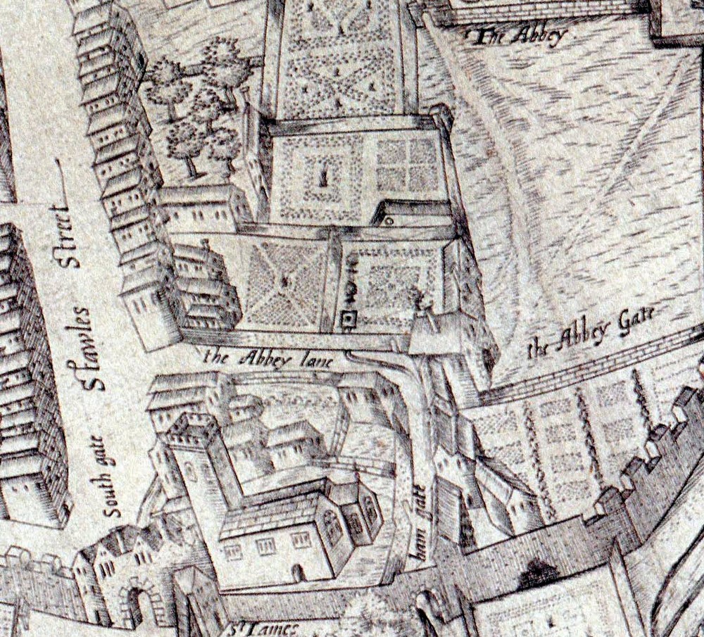 buildings. The Abbeygate demolished in 1733 is shown as the main entrance to the precincts, only an iron hinge on a wall by Blacks shop remains of it, although a fragment of the ancient Abbey Wall can still be seen in little Orchard Street, behind Marks & Spencers. |