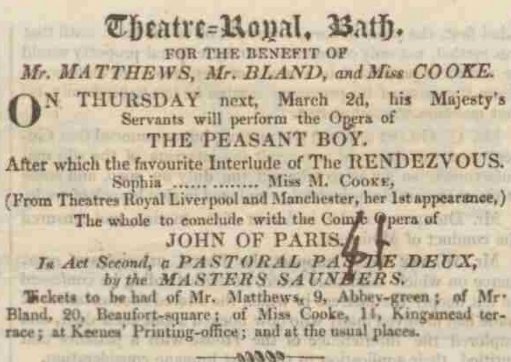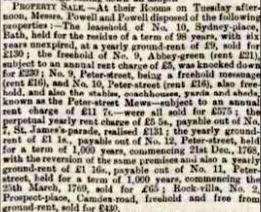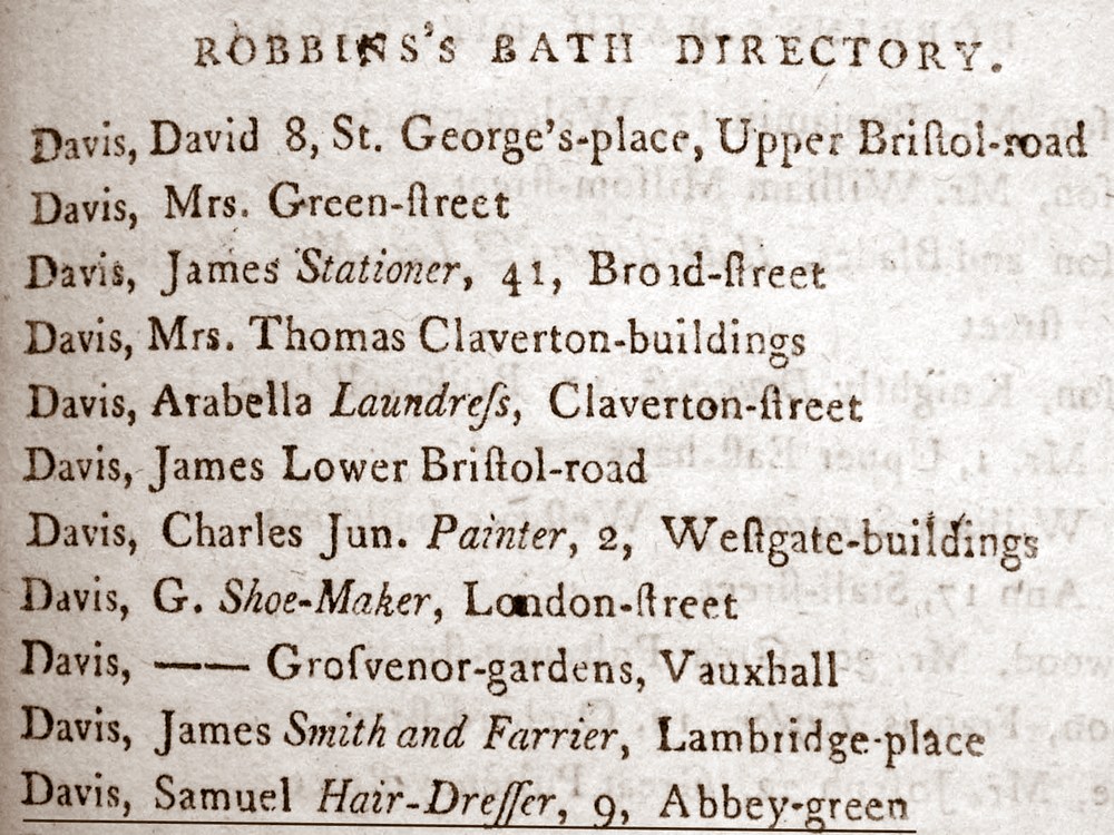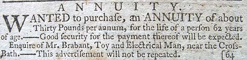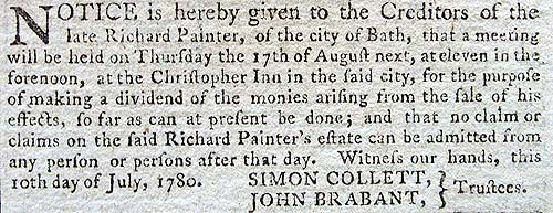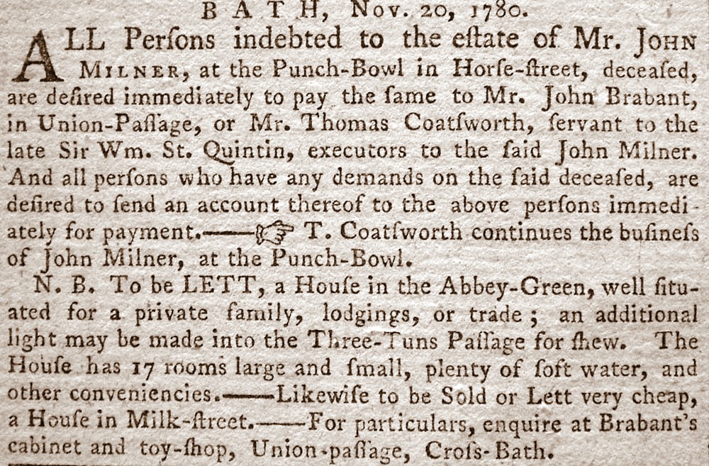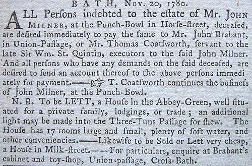 | 1771 Goods: Brabant & Co have removed their new & second hand furniture, china & glass business from warehouse in Quiet St, Bath to larger warehouse on corner Union Passage & Cross Bath Pump Room. Clean household goods bought or exchanged. 1780 Goods: auction - household goods of house 1 door below Tuns Psg, Abbey Green, Bath 14 & 15 Sep by Daniel Dickes. Enq Mr Brabant, toy warehouse, Union Psg, Bath; or D. Dickes, Market Pl, Bath. House to be let suitable for lodging or trade 1780 December Property: to let - a house with 17 rooms in Abbey Green Bath. An additional light may be made into Three Tuns Passage. Partcs at Brabant, cabinet & toy shop, Union Pssge, Cross Bath. 1780 Finance: all persons indebted to estate of John Milner, decd at The Punch Bowl, Horse St, Bath to pay Mr John Brabant, Union Pssge, or Mr Thomas Coatsworth, servant to the late Sir William Quinton (the excrs of said John Milner). Creditors to send A/Cs to excrs. 1782 Property: ## to let - house on on S-W side of Kingsmead Square, Bath, with 3 sorts of water, lofty rooms, free from offensive smells as sewers contrived to prevent such, large room convenient for workshop in upper part of house, excellent shop against the street. Enq John Brabant, Cross Bath; S. Hazard, Cheap St, Bath. 1788 Finance: wanted to purchase annuity of about £30 p.a for life of person 62 years, good security. Enq Mr Brabant, toy & electrical man nr Cross Bath, Bath. 1798 Deaths: Mrs Brabant, wife of Mr Brabant, medical electrician of this city on Thursday |