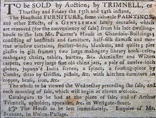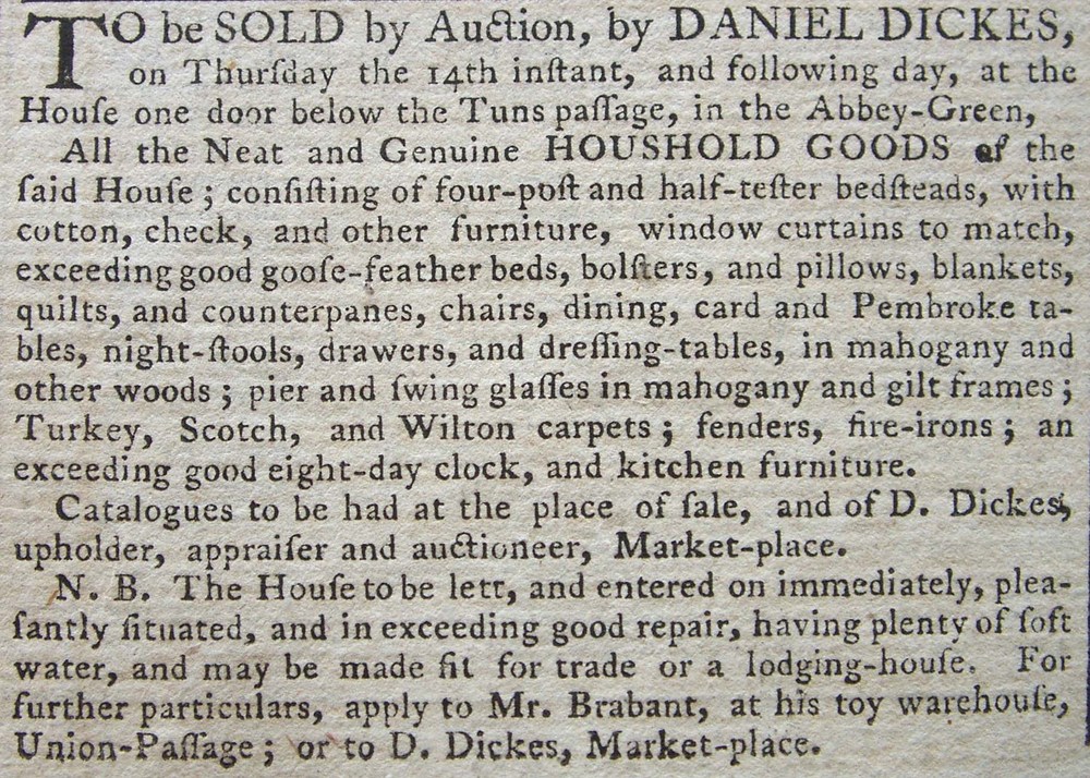 To be SOLD by Auction, by DANIEL DICKES, on Thursday the 14th inftant, and following day, at the House one door below the Tuns paflage, in the Abbey-Green, All the Neat and Genuine HOUSEHOLD GOODS at the said Houfe ; 14 September 1780 - Bath Chronicle