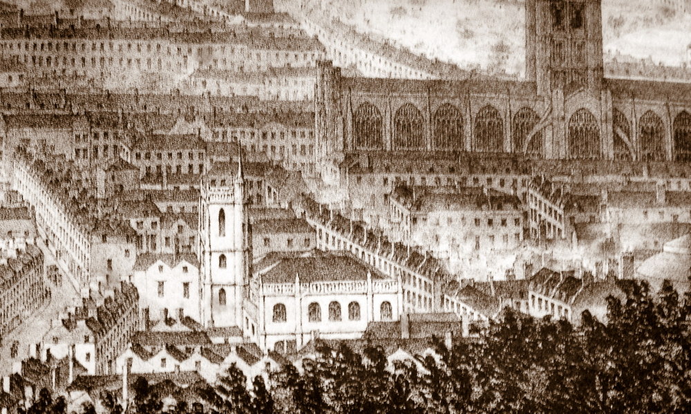| An Engraving by Harvey Wood showing the old St. James Church in foreground and Abbey Green in the centre. The domed building on the extreme right is that of a school that stood there once. | ||||||||||||||||||||||||||||||||||||||||||||||||||||||||||||||||||||||||||||||||||||||||||||||||