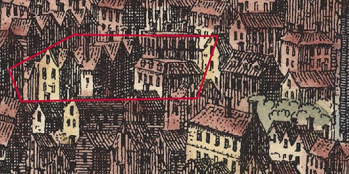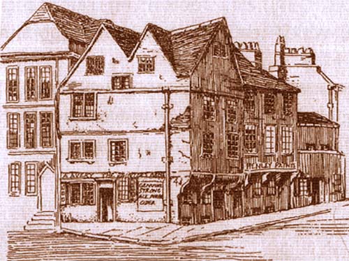 The Three Tuns can be seen as the gabled building on the left foreground of this engraving of 1675 by Johnson. |