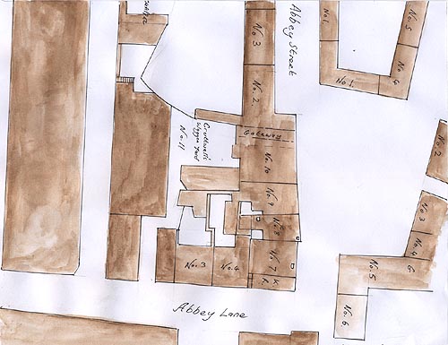 | This original plan shows 9 Abbey Green before it was rebuilt by John Brabant with a gabled front similar to its neighbour. | ||||||||||||||||||||||||||||||||||||||||||||||||||||||||||||||||||||||||||||||||||||||||||||||||
