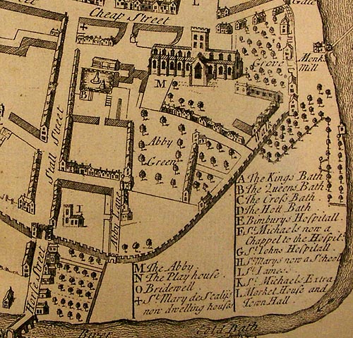 Map of Bath in 1692. It shows Abbey Green with the gateway at the bottom leading